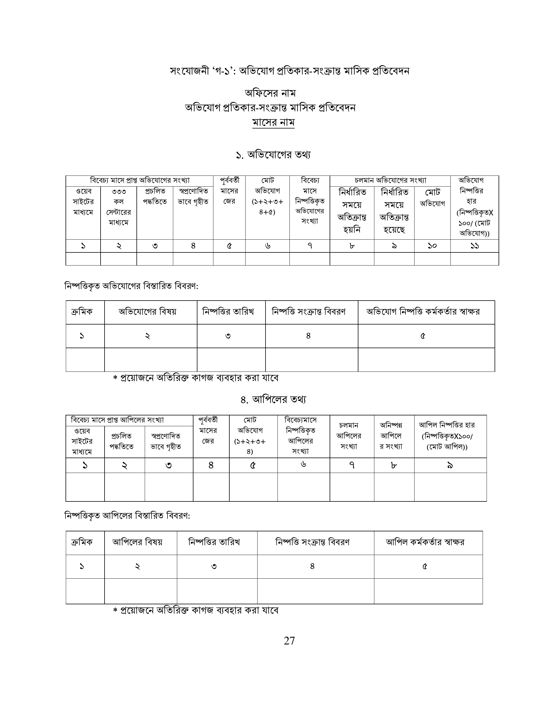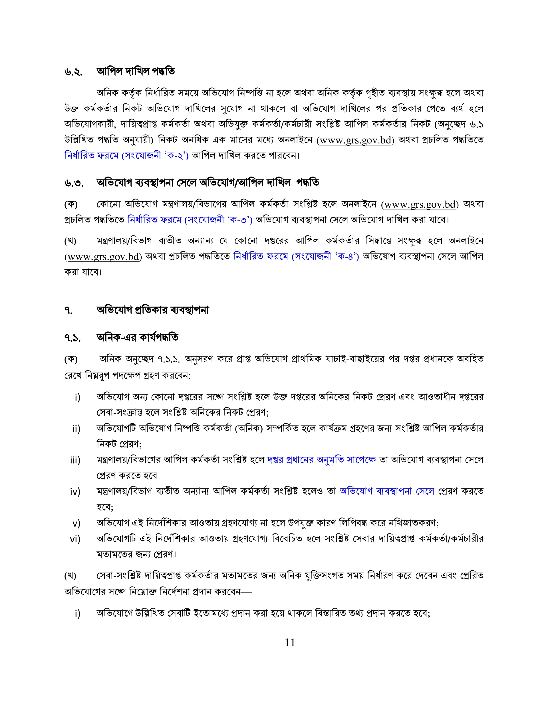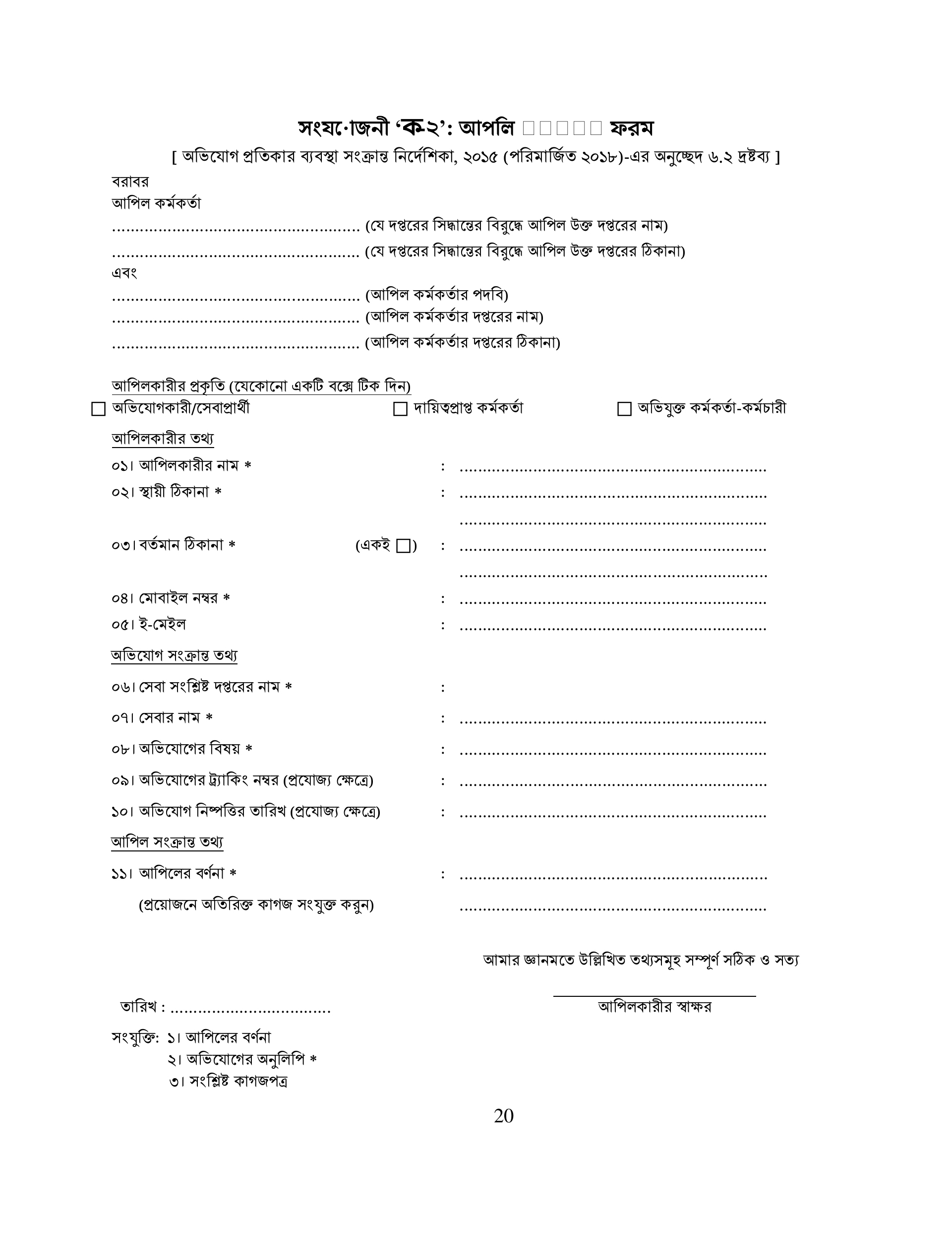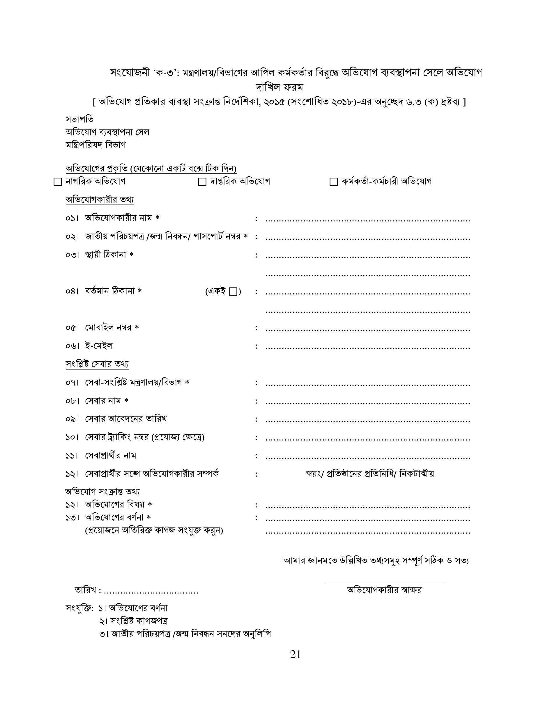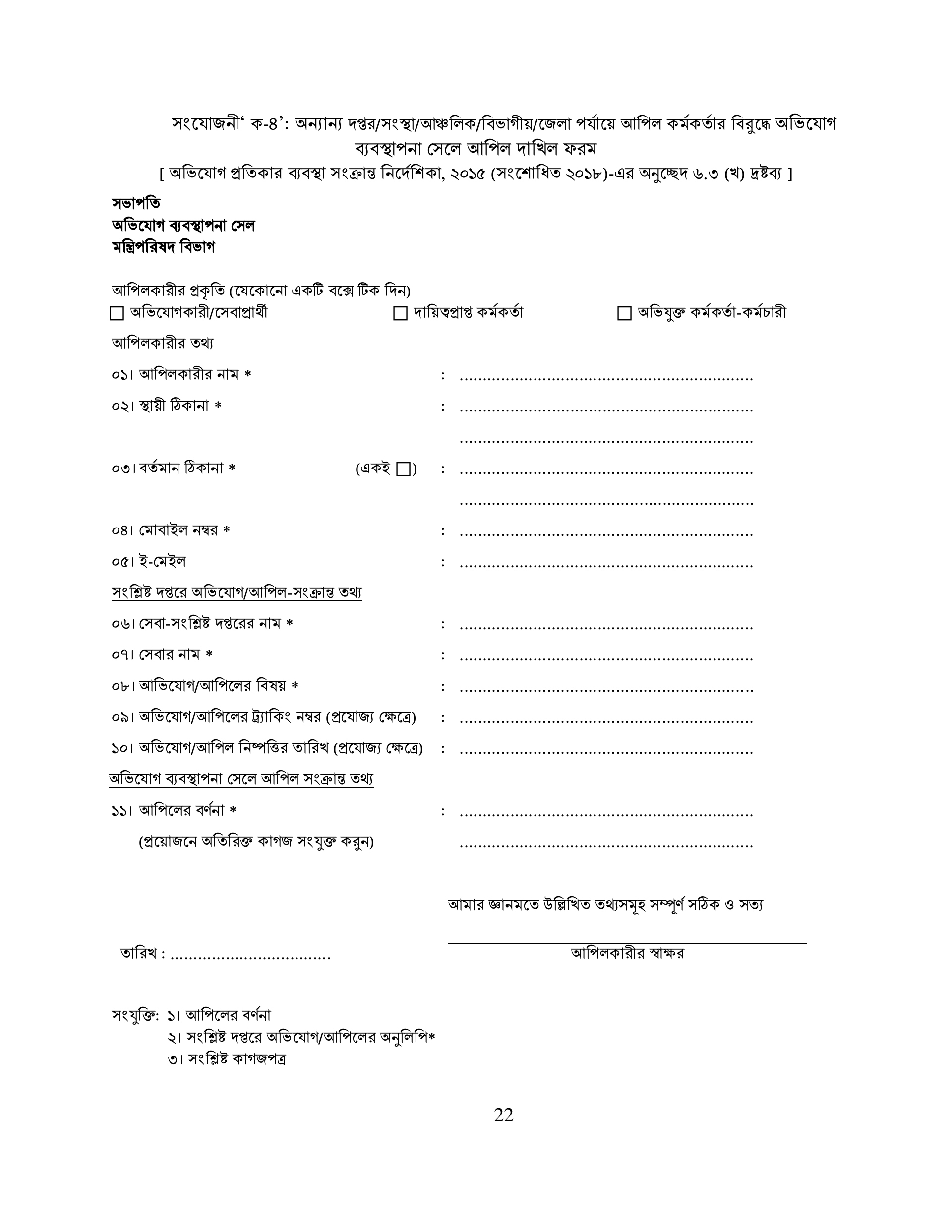 | ৩ | আপিল কর্মকর্তা নির্দিষ্ট সময়ে সমাধান দিতে না পারলে | মন্ত্রিপরিষদ বিভাগের অভিযোগ ব্যবস্থাপনা সেল |